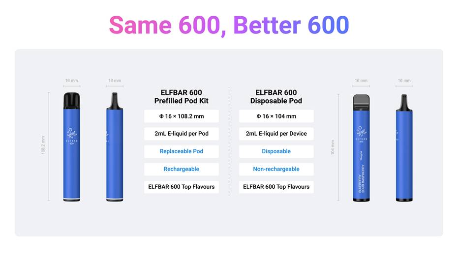 The kit includes a 600-pod cartridge, prefilled with Elf Bar's celebrated Elf-Liq 20mg (2%) nic salt e-liquid, available in a vibrant selection of their most sought-after flavors. This enables users to savor a remarkably smooth mouth-to-lung experience with their classic flavor combinations. Users can select from a variety of appealing options within the replacement Elf Bar 600-pod cartridge range.