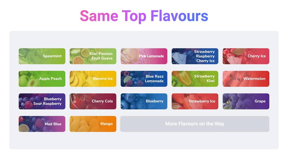 Elf Bar boasts an extensive collection of seventeen flavours inspired by its award-winning ElfLiq nic salt range. These flavours offer a diverse mix of fruity, icy, and sweet combinations to cater to all vaping preferences.