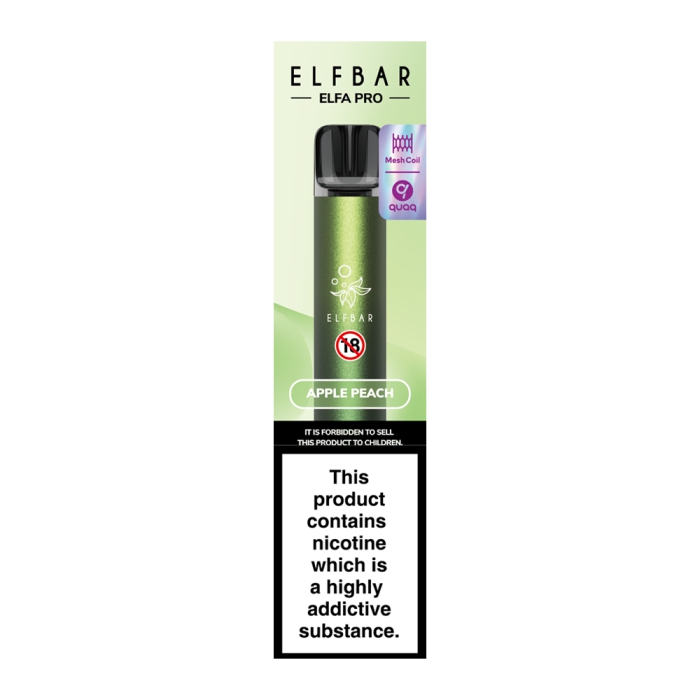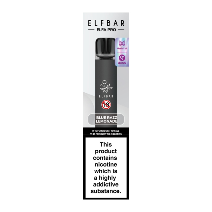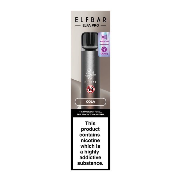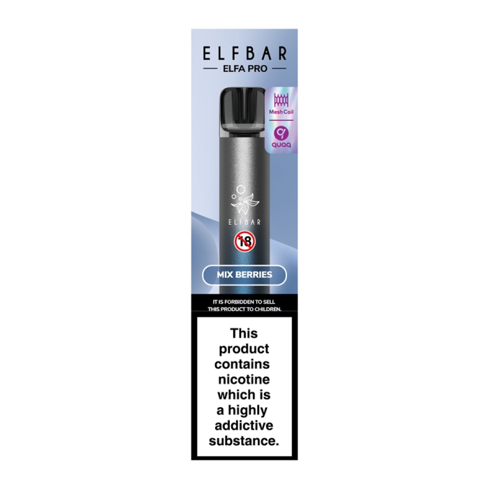 Two ml 20mg nicotine salt e-liquid prefills Elfa Pro pods. The body absorbs nicotine salts quickly, which helps to smooth the throat hit and hence fulfil cravings. One pod can produce 600 puffs. Expanding surface area and highly absorbent wicking material of the integrated 1.2 Ohm QUAQ tech mesh coil improve flavour delivery. Elfa Pro devices fit both Elfa and Elfa Pro pods. Users may choose refillable Elfa pods to go with any of our 50% VG e-liquids, or the prefilled pods feature tastes inspired by the famous Elf Bar disposable vapes.