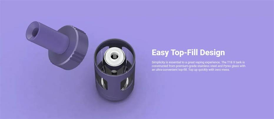 Fast to refill, the T18 E vape tank has a top-filling system letting you refill without taking the tank off your mod. You can combine the kit with a broad variety of 50/50 e-liquids and high PG choices as well, able to contain up to 2ml of E-liquid. For devices like this, Nic salts are rather common since they will provide a more smoother throat sensation when vaped.