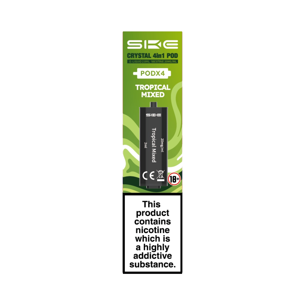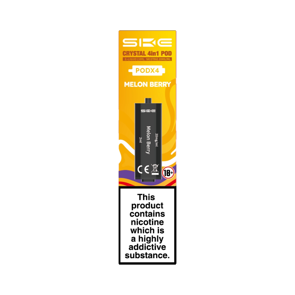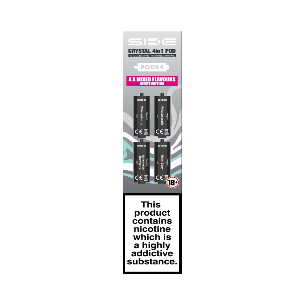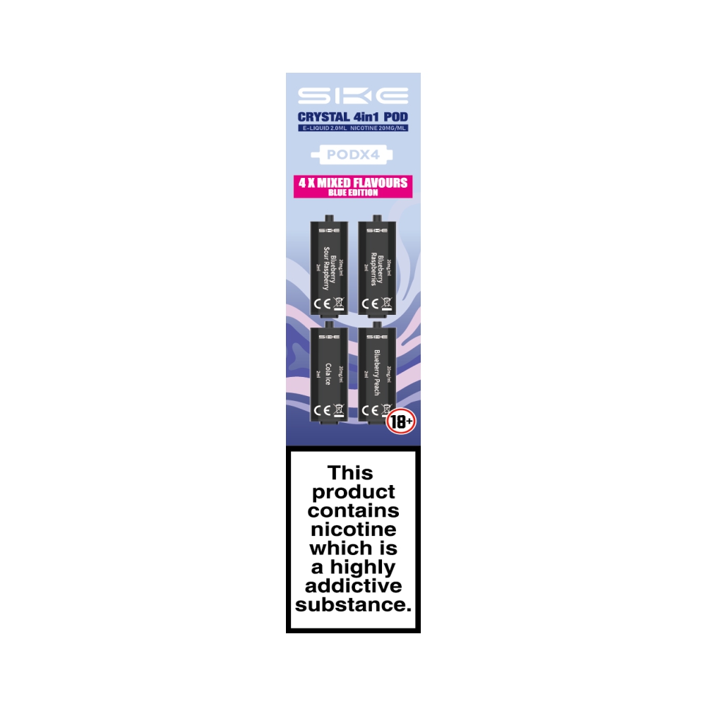 20 mg (2%) nicotine salt e-liquid makes up each replacement pod for the SKE Crystal 4in1 pod vape system. There are five multipack varieties of these pods, and each pack has four flavours.